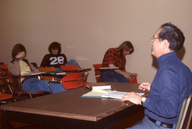 Professor Miles Shishido, who taught Religion and Philosophy at Pacific University for several decades, teaching a class. Students sit at desks in the background. The original slide was printed in March, 1979.