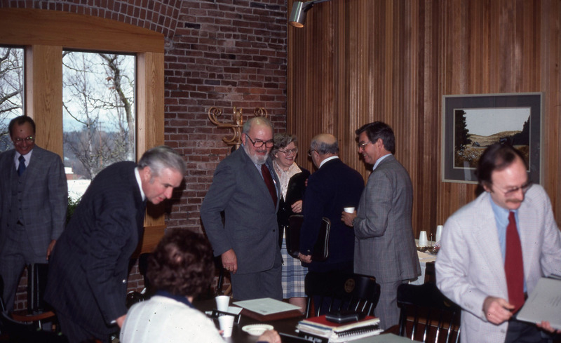 Several men attending a Pacific University Board of Trustees meeting on the third floor of Marsh Hall. This is one of a set of photographs that were all taken during the same meeting. The original slide was printed in March, 1979.
