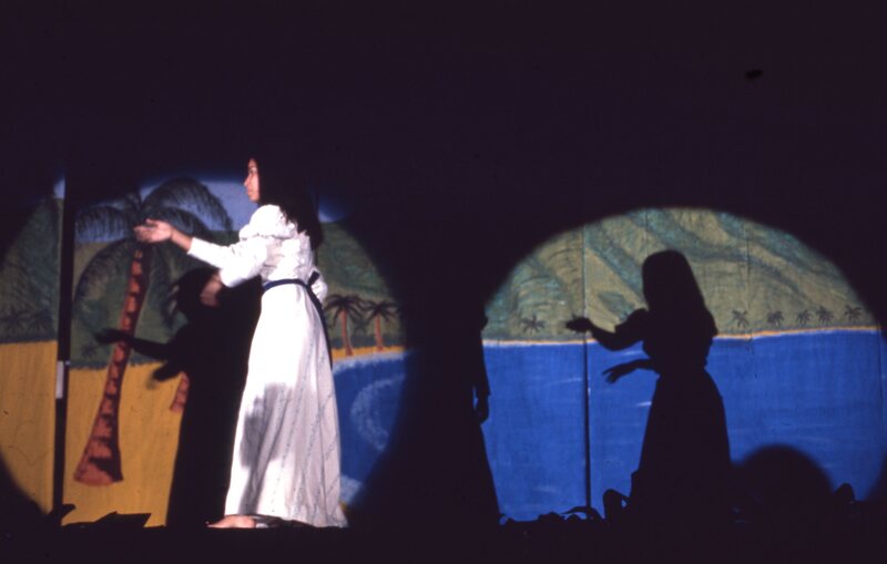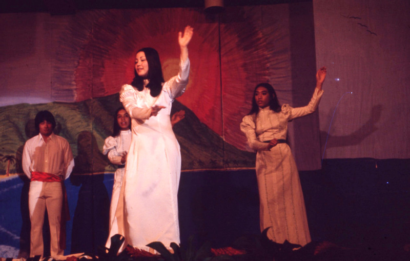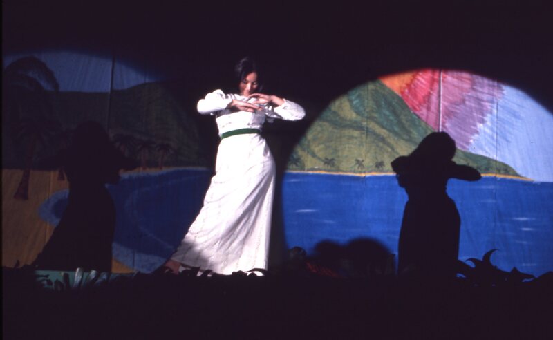 A Pacific University student in a white satin dress, dancing on stage at the university's annual Lu'au in 1975. She was likely performing as the "Queen" of the Lu'au; this role usually donned a similar white dress and performed a special dance. The women in the back were likely "Princesses," each of whom represented a different island.