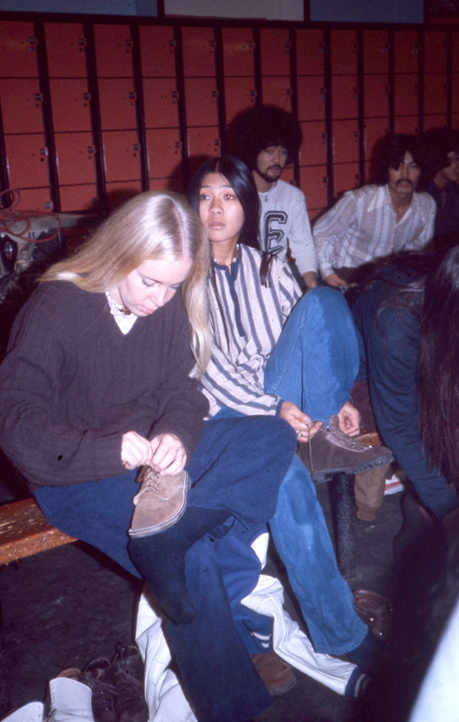 Pacific University students in December 1971, putting on their shoes at an ice skating rink. One student is identified on the original slide as "Debbie." This image may have been taken during a Haumana O Hawai'i (Hawaiian Club) holiday event.