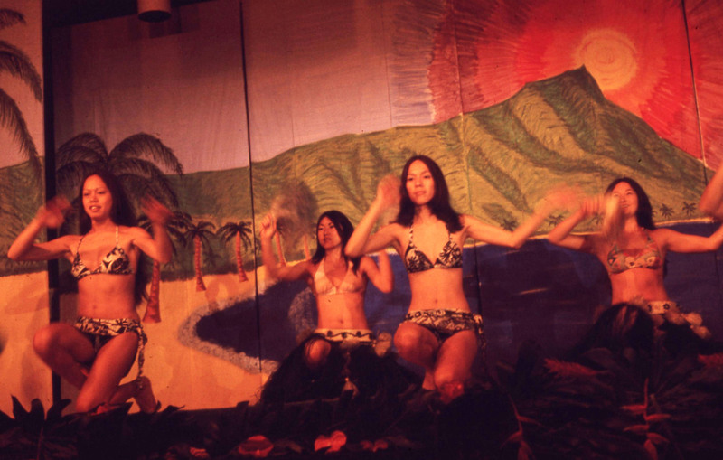 A group of women students performing a Tahitian-style dance on stage at Pacific University's annual Lu'au in 1975. Two are wearing Tahitian-style grass skirts and holding grass hand tassels; the other two are wearing matching bikini tops and skirts. The photographer, Peg Osland, was on the staff of Pacific's publicity department.