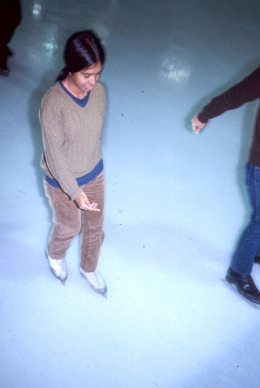 Louise Seymour, a Pacific University student (Class of 1975), ice skating in December, 1971. This image may have been taken during a Haumana O Hawai'i (Hawaiian Club) holiday event.
