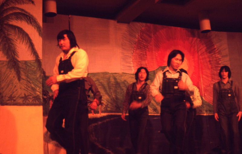 Pacific University students performing a dance in overalls on stage at the university's annual Lu'au in 1975. The photographer, Peg Osland, was on the staff of Pacific's publicity department.