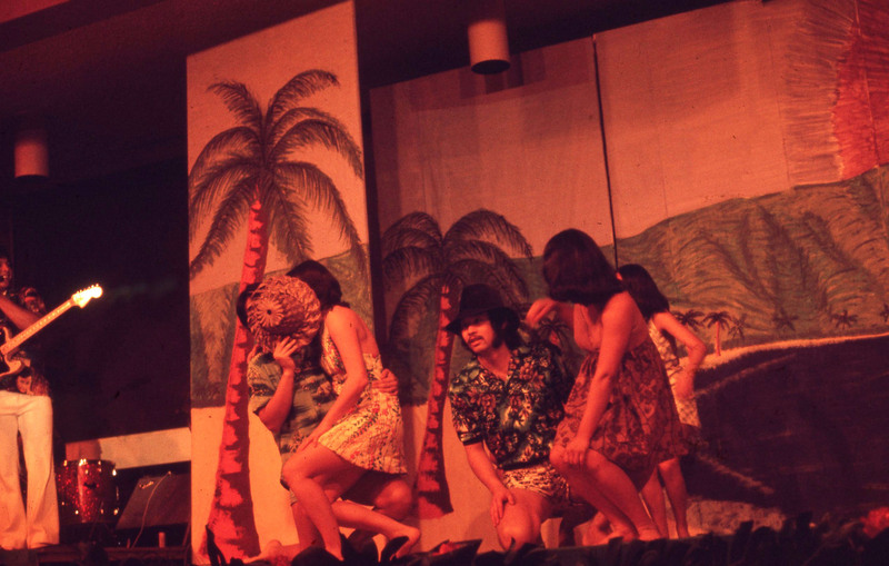 Pacific University students performing while wearing ti leaf skirts on stage at the university's annual Lu'au in 1975. The photographer, Peg Osland, was on the staff of Pacific's publicity department.