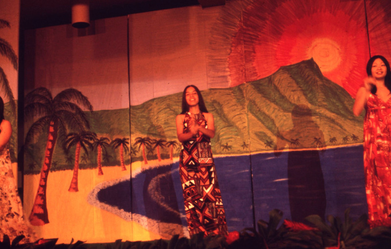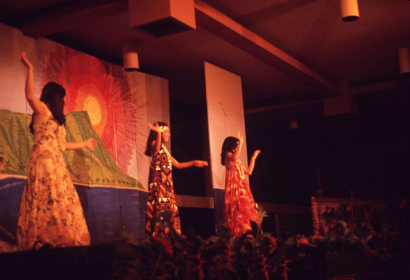 Pacific University students performing a dance on stage at the university's annual Lu'au in 1975. The photographer, Peg Osland, was on the staff of Pacific's publicity department.