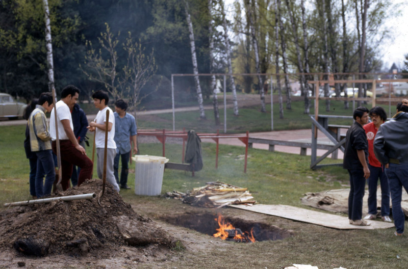 A group of students and/or family members tend the kalua pig pit roast at Pacific University's annual Lu'au in 1972. Tennis courts are visible in the background.