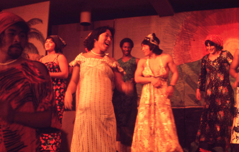 Male Pacific University students performing in drag on stage at the university's annual Lu'au in 1975. The photographer, Peg Osland, was on the staff of Pacific's publicity department.