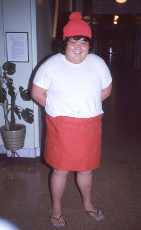 Elton Sumida, a Pacific University student (class of 1973), dressed in a red cap and skirt in December, 1971. This image may have been taken during a Haumana O Hawai'i (Hawaiian Club) holiday event.