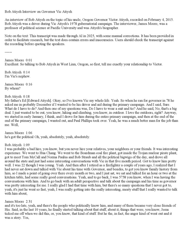 An interview of Bob Atiyeh on the topic of his uncle, Oregon Governor Victor Atiyeh, recorded on February 4, 2015. Bob Atiyeh was a driver during Vic Atiyeh's 1978 gubernatorial campaign. The interviewer, James Moore, was a professor of political science at Pacific University and was Atiyeh's biographer.