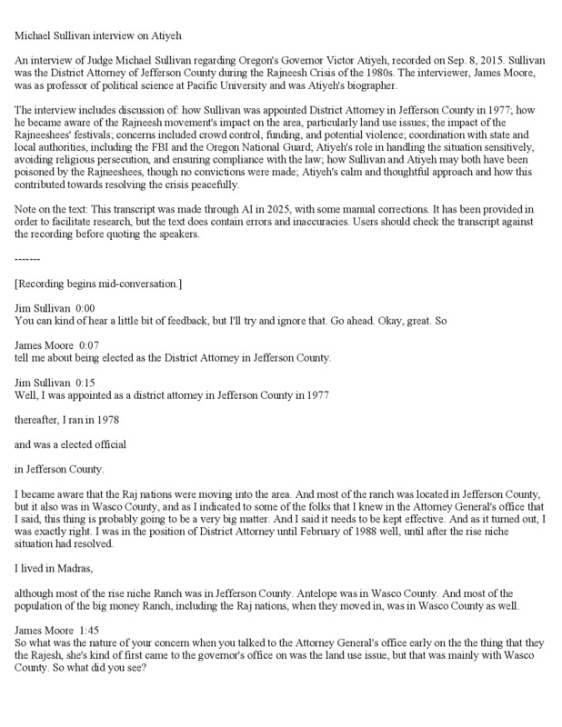 An interview of Judge Michael Sullivan regarding Oregon's Governor Victor Atiyeh, recorded on Sep. 8, 2015. Sullivan was the District Attorney of Jefferson County during the Rajneesh Crisis of the 1980s. The interviewer, James Moore, was as professor of political science at Pacific University and was Atiyeh's biographer.
