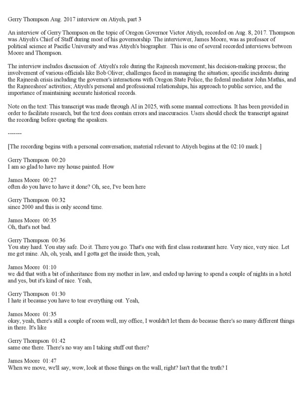 Gerry Thompson Aug. 2017 interview on Atiyeh, part 3