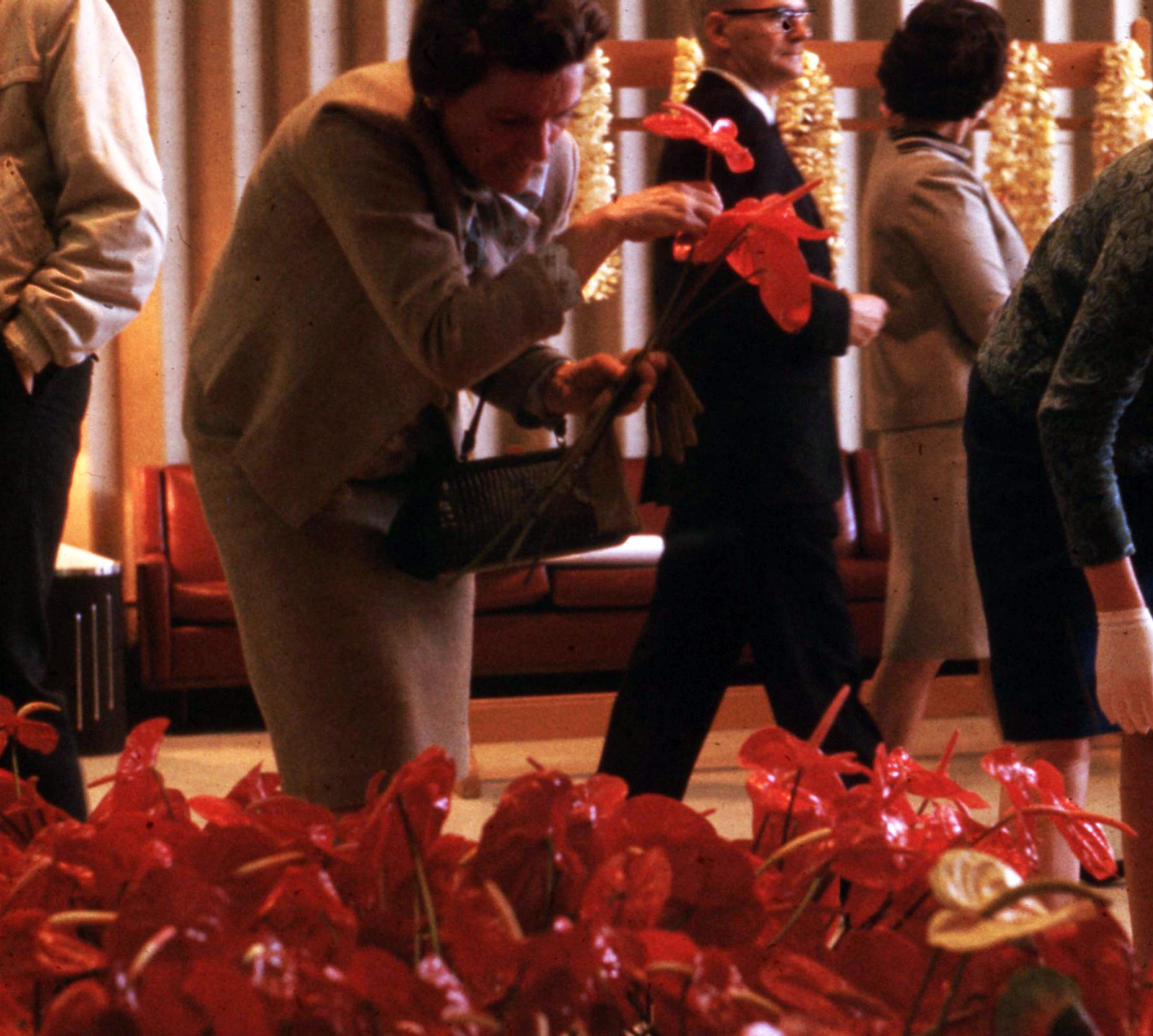 An attendee of Pacific University's annual Lu'au in 1966 purchasing anthurium flowers. Leis, which were likely also for sale, are visible in the background. The Haumana O Hawai'i Club, which hosted the event, organized air shipments of fresh flowers, fruit, and other goods from Hawaii to sell at vendor tables during the event.