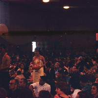 A procession of performers through the audience at Pacific University's annual Lu'au in 1964. A handwritten note on the original slide reads: "Audience watching program begin." The performers appear to be members of the "Royal Court," a group of performers who presided over the event. The woman wearing white in the center of the image may be Shirley Ann Kapuniai, who was the Queen that year. This event, one of the earliest of Pacific's annual Luaus, took place in the Forest Grove High School gym. The original slide was very dark and was digitally enhanced in order to be visible.