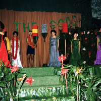 A Pacific University student performs a dance at the university's annual Lu'au in 1964. A handwritten caption on the original slide describes the scene as "Royal Court watches hula performed." The "Royal Court" was a portion of the Lu'au in which students representing the King (wearing a yellow cape) and Queen (wearing white) of Hawaii witnessed dances performed by Princesses who represented the various islands of Hawaii. Those identified in this image include King Dayton Arruda (Class of 1967) and Queen Shirley Ann Kapuniai. This event, one of the earliest of Pacific's annual Luaus, took place in the Forest Grove High School gym.