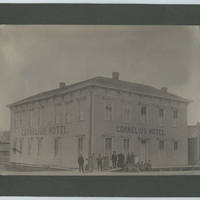Black and white image of a two-story, square, hip-roofed building. A row of people stands in front, including several children and one man holding a bicycle. Several boys in hats sit on the boardwalk in front of the hotel. 'Cornelius Hotel.' [sic] is emblazoned between the floors on each visible side of the hotel.