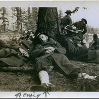 Black and white image of a number of men lounging beneath a tree while others in the background stare out over a body of water. Trees and groundcover in the image appear to be more reminiscent of the Pacific Northwest than the South Pacific. During World War II, following the attack on Pearl Harbor, much of the 41st Infantry Division was deployed to protect the coasts of Washington and Oregon against a possible Japanese invasion. In 1942, the Division was deployed overseas, including the band, and saw service in the South Pacific. Elroy Gravelle, to the left of the image, was a long-time Portland area resident who enlisted in the National Guard as a musician in 1940.