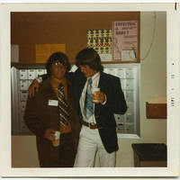 Two Alpha Zetas in formal dress stand next in a hallway next to a set of mail boxes
