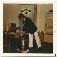 An Alpha Zeta member, in white bellbottoms, gets a drink from a keg sitting on a floor. There is a Pepsi machine in the background.