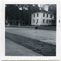 Three unidentified male students playing tennis in May. The court is next to Old College Hall.