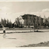 A photo of two tennis courts where unidentified female students play games of tennis. The old gym is in the background.