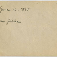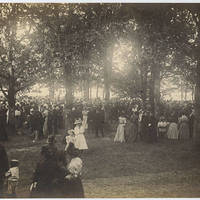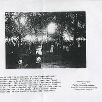 From back of photo: June 16, 1898, Golden Jubilee; From additional material: Nearly all the delegates to the Congregational National Council boarded a special Southern Pacific train from Portland to attend the Semi-Centennial (50th anniversary) of Tualatin Academy and Pacific University, celebrated June 9, 1898. In all, 1,000 attended and were fed at long tables stretched out in the shade of the campus tress. (Courtesy of the Pacific University Archives)