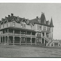 A photo of Herrick Hall before it burned down. There are five students standing on the second balcony.