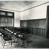 An interior photo of a classroom in Old College Hall. Two rows of desks sit in front of a clean blackboard. The teachers desk and books are in the corner.