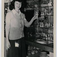 A photo of Helen Cox Meyers standing in shop displaying ceramic and glassware items.
