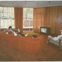 A group of students are watching television in Pacific University's Clark Hall Lounge. There is a view of the Pacific University campus outside of the window.