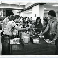 A group of students at the condiments station in the Washburne Hall cafeteria located at Pacific University.