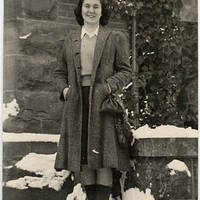 A photo of Laura Whalley in a knit jacket standing in the snow in front of Marsh Hall.