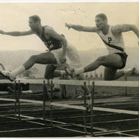 Photo of a hurdles race, with three runners visible. Two of the runners are from the University of Portland and Pacific University.