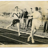 Photo of the hand-off in a relay race being run by Pacific University. A small crowd watches.