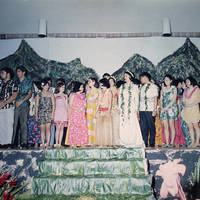 A large group of performers/students in Hawaiian costumes on stage at Pacific University Lu'au. Also shows stage decoration.