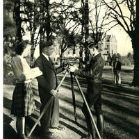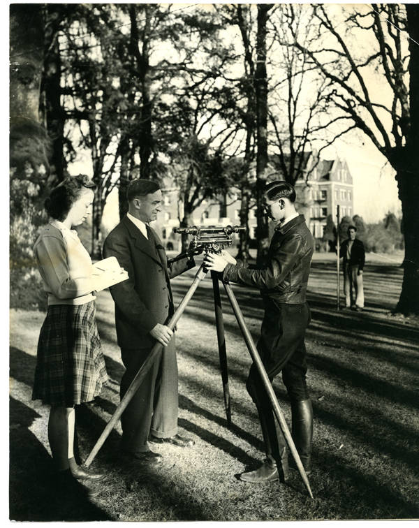 Three Pacific University students practice surveying with an instructor on campus. Herrick Hall can be seen in the background.