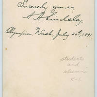 [front] A. A. Lindsley. 1870 [back] Sincerely yours,/A. A. Lindlsey,/Olympia, Wash. July 20th, 1891/students and alumni K -L/Taken June 2nd, 1891.