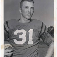 Marvin Rueck, co-captain of the Pacific University football team while at school, poses for a portrait with a football. He graduated later in 1961.
