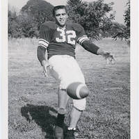 Robert E. Dixon, a senior and quarterback, kicks a football. He graduated from Pacific University in 1959 and became a teacher at Stayton High School.