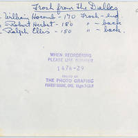 [back] Frosh from The Dalles. Left - William Hocomb - 170 - Frosh - end. Center - Robert Herbst - 180 '' - back. Rt - Ralph Ellis - 150 '' - back.