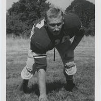 Ralph D. Perkins, a Pacific University junior and football player, crouches in a defensive stance. He graduated in 1961 and went to work for the school district of Pleasant Hill, Oregon.