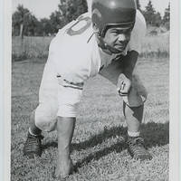 Ernest Kaai, a Pacific University sophomore and football player, poses in a defensive stance. He is from Hanapepe, Hawaii.