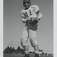 Gary M. Berg, a freshman and Pacific University football player, poses with the ball. He graduated in 1962.