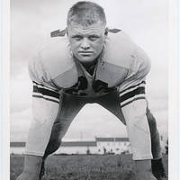 Jack Markgraph, a Pacific University football player, poses in a defensive stance.