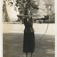 An unidentified young woman poses with a bow and arrow at Pacific University.