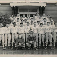 Pacific University's 1946 or 1947 football team. The coaches, kneeling up front, are Don Bryant (Left) and Cooney Anderson (Right).