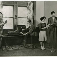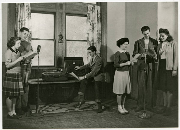 Photograph of Pacific University students, who appear to be recording their voices, either singing or reciting a play.