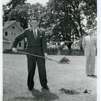 Photograph of President Armstrong holding a shovel at the Pacific University groundbreaking of Judith Scott Walter Hall.