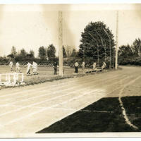 Photograph of Pacific University students practicing baseball on the field next to the track.