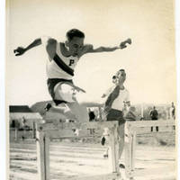 Photograph of Donald Young, Pacific University Class of 1961, jumping over a hurdle in a race.