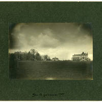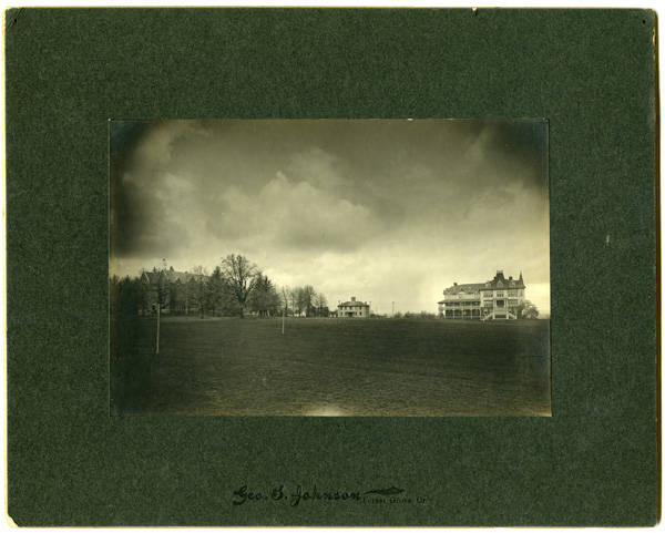 Photograph of the Pacific University campus during s storm. The visible buildings, left to right, are: Marsh Hall, Old College Hall and the original Herrick Hall.